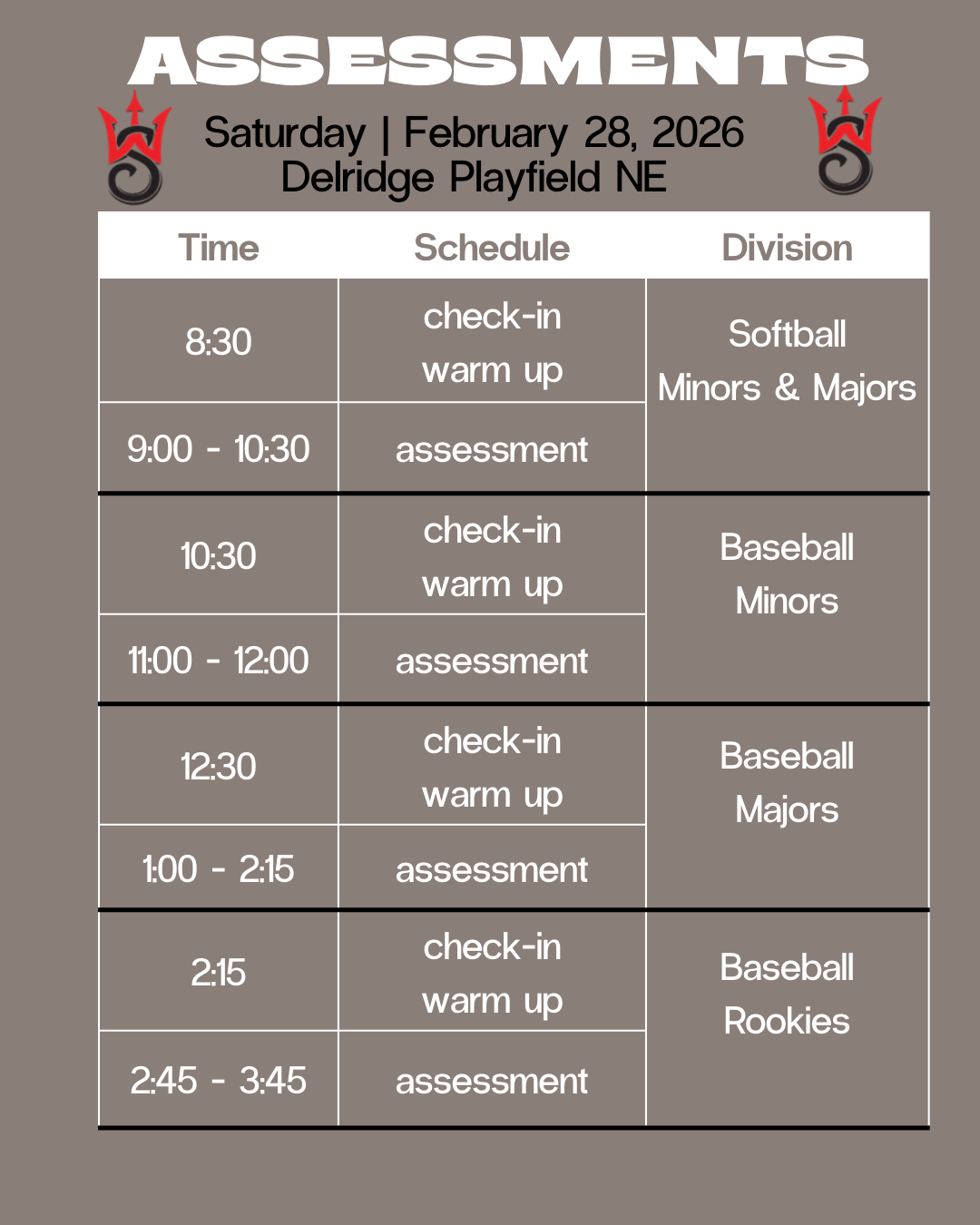 - 8:30-10:30 Softball Minors and Majors
